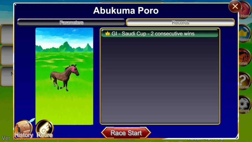 On the screen where horse data such as Speed, Stamina, and Spirit is displayed, we added two tabs: “Parameters” and “Records.”